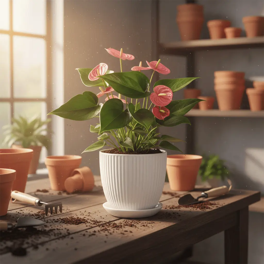 Being an epiphyte, Anthuriums require a light, airy, and well-draining potting mix. A mix of orchid bark, coco coir or peat moss, perlite, and a small amount of compost provides the perfect balance of moisture retention and aeration. Avoid dense soil that can hold water and suffocate the roots. Repot your Anthurium every 1–2 years or when it becomes root-bound, choosing a pot just slightly larger than the previous one. Spring is the ideal season for repotting, as longer daylight stimulates new growth and flowering.